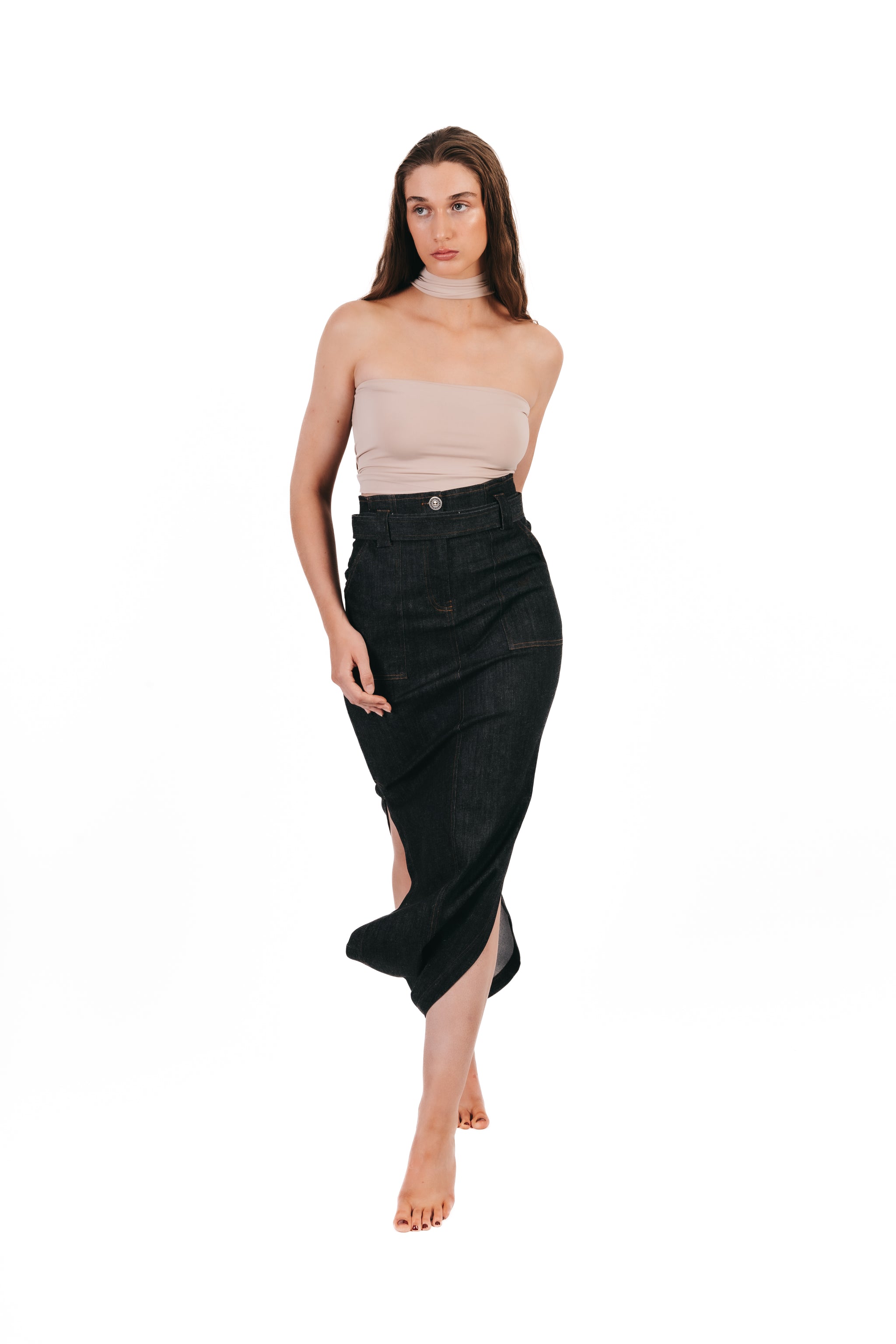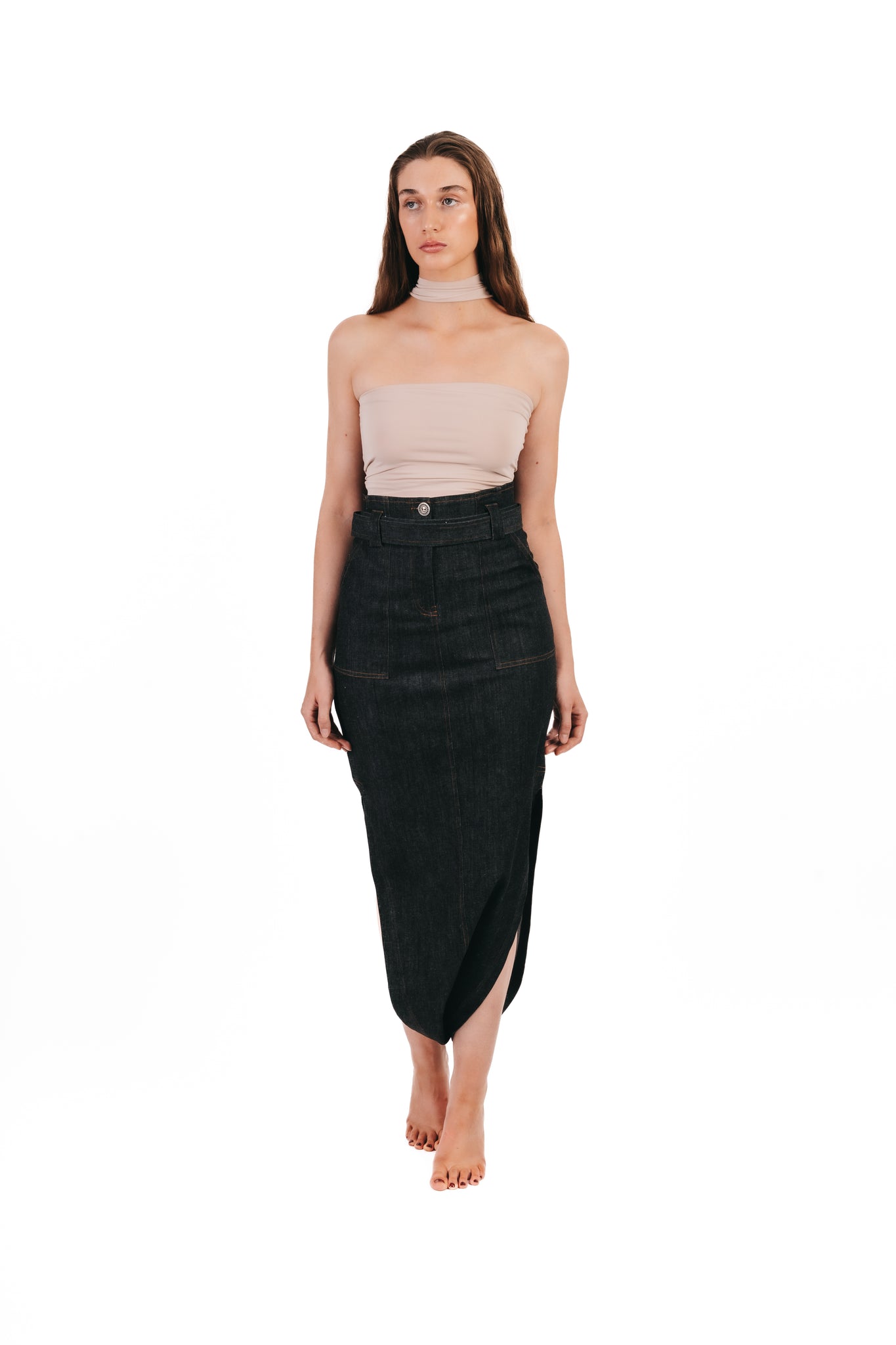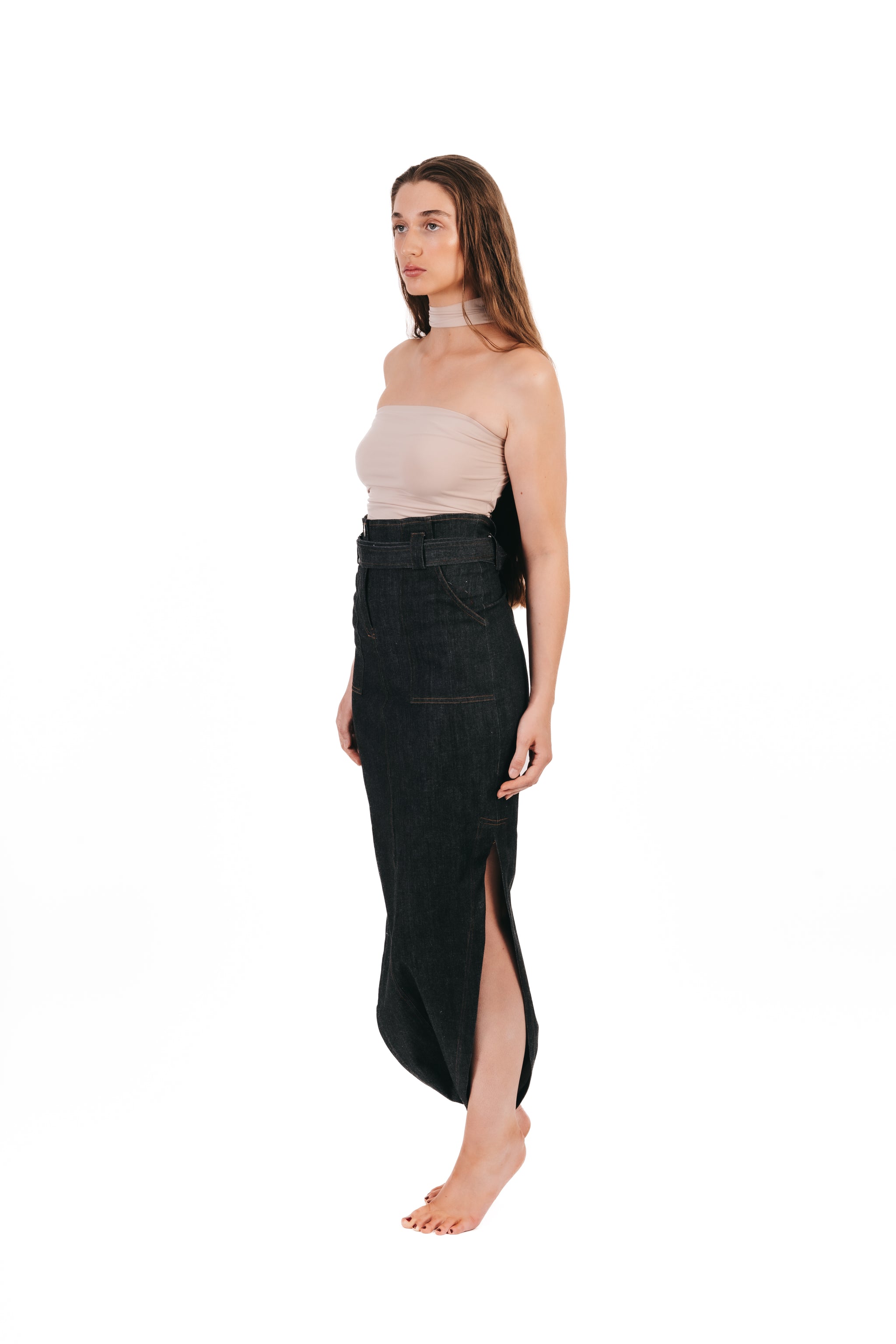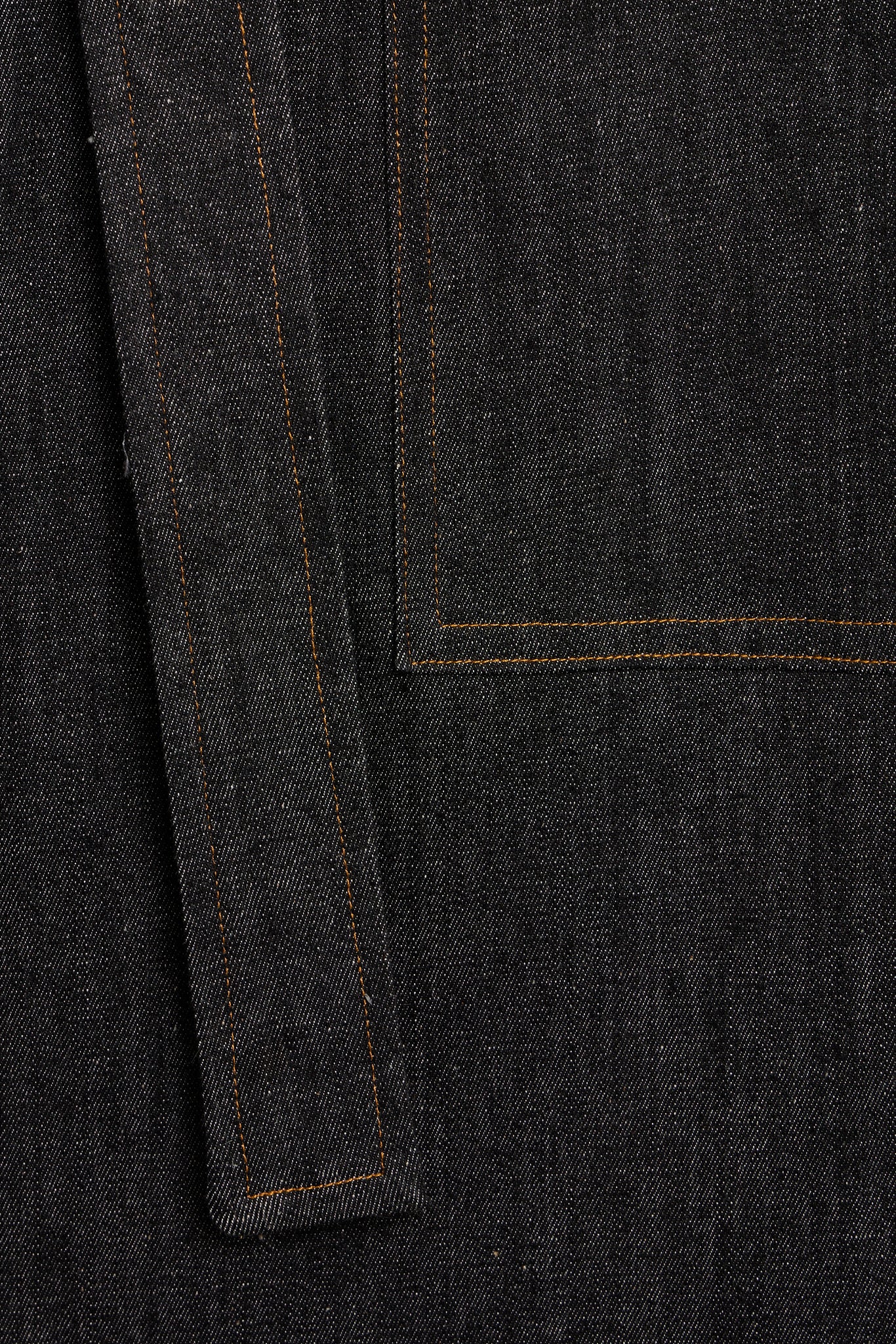Confectionné en denim noir souple, le sarouel BYBA revisite une coupe emblématique avec une taille haute ceinturée et une silhouette fluide.